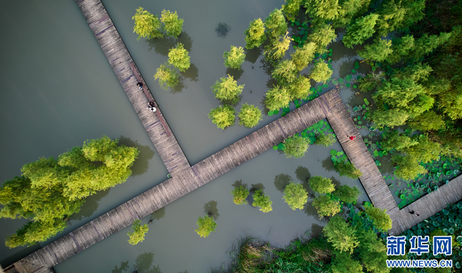 近日,安徽省铜陵市西湖城市湿地公园,杉树、荷叶与碧水交相辉映,构成一幅美丽画卷。