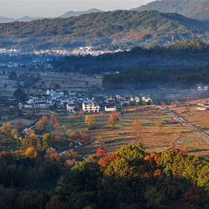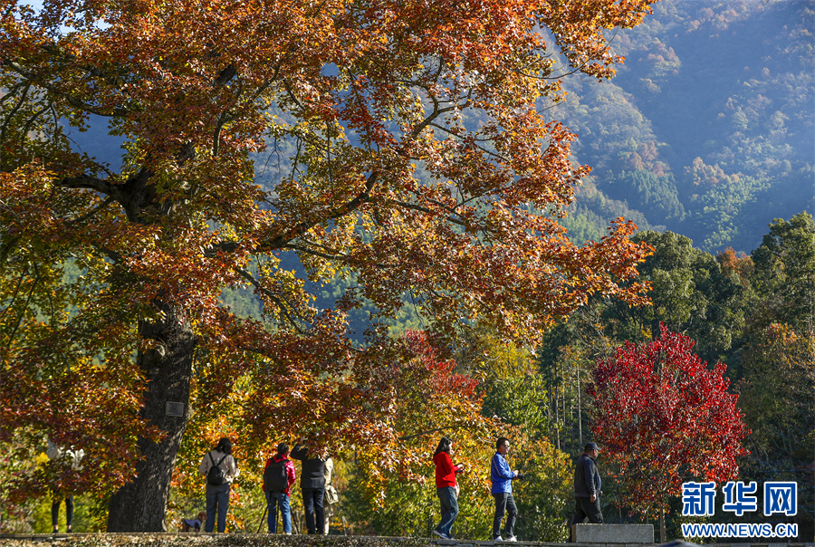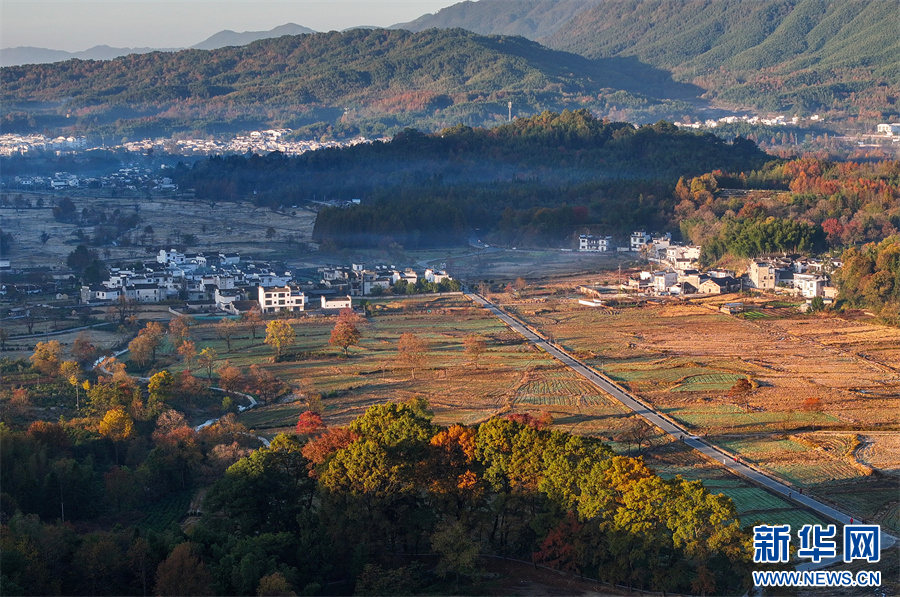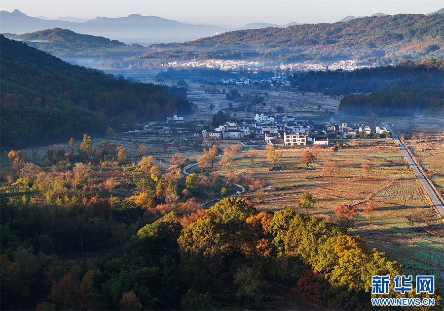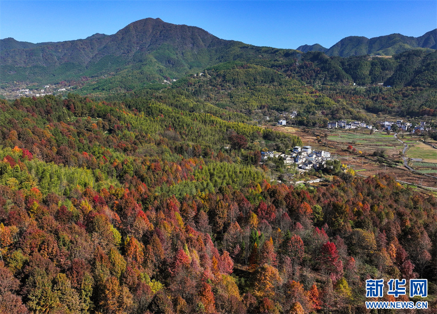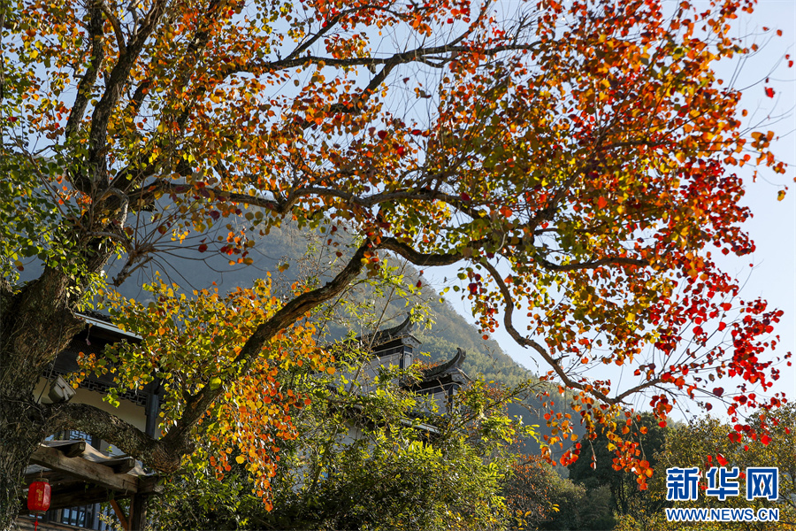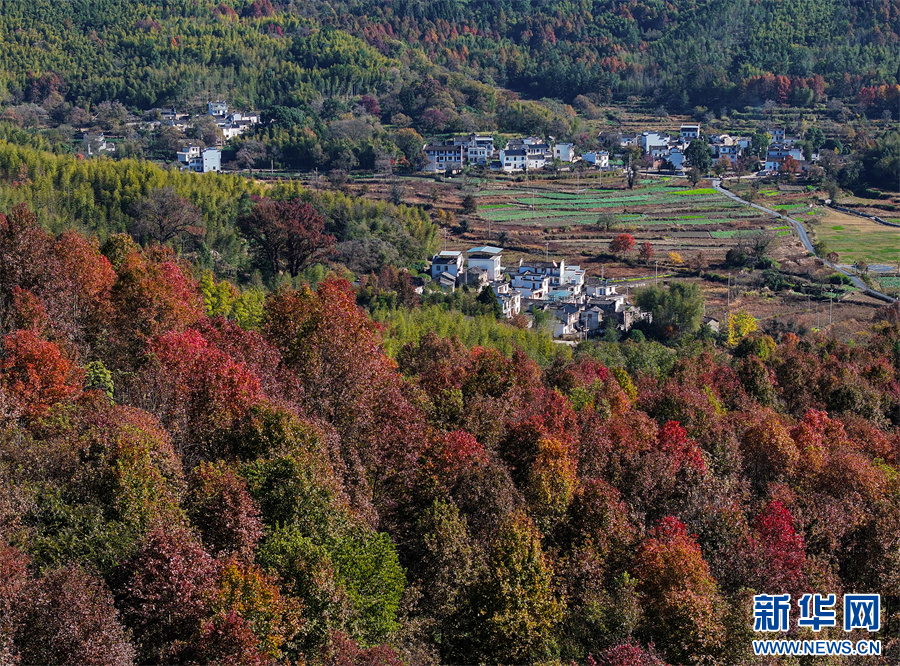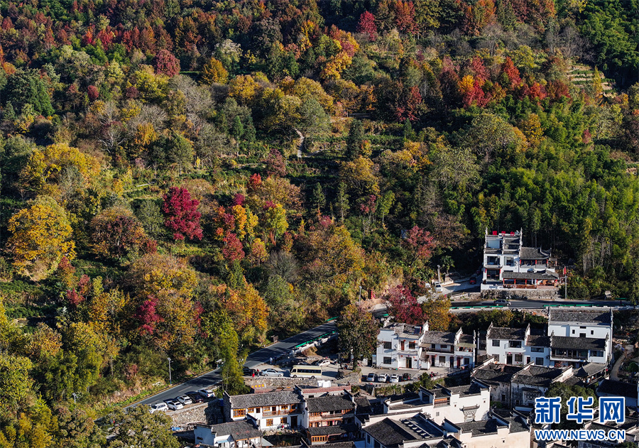 初冬时节,塔川国家森林公园层林尽染,粉墙黛瓦的徽派古民居掩映在色彩斑斓的美景中,灿若图秀。 新华网发(施亚磊 摄)