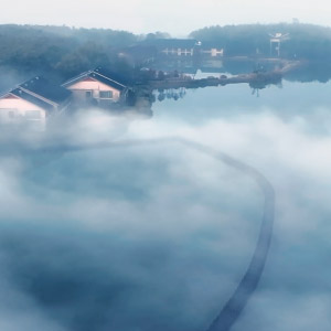 风景区被层层雾气笼罩,湖光朦胧,若隐若现,宛如画卷。