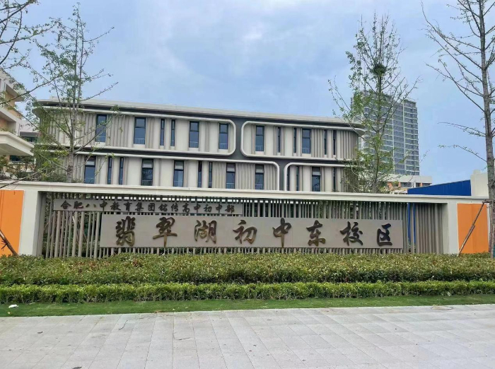 合肥八中铭传高中教育集团翡翠湖初中东校区位于肥西经开区丹霞路与蓬莱路交叉口,总用地面积80亩,总建筑面积约47440平方米,规划建设规模为48个班,可提供学位2400个,将极大缓解肥西经开区初中阶段“入学难”。学校设计上致力于打造一个环境优美、开放互动、全面发展、智能体验的“林中书院”。目前学校已经完成验收交付。