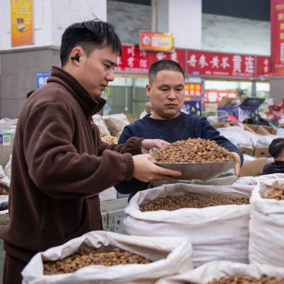 11月10日,药商在亳州中药材专业市场分装中药材。