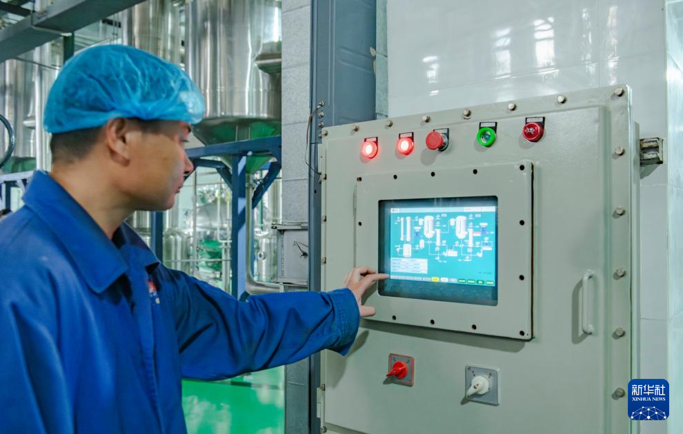 11月10日,在华佗国药股份有限公司的中药智能化提取车间,工作人员操作车间控制系统。
