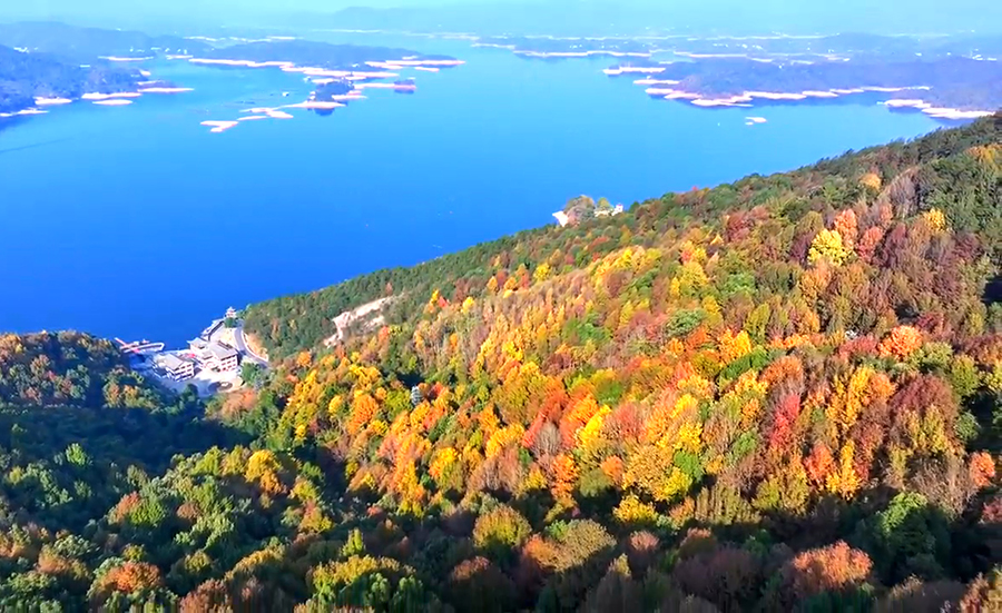 初冬时节,位于安徽省太湖县的九井溪省级森林公园和花亭湖风景区,群山层林尽染、色彩斑斓,倒映在清澈的万顷碧波里,呈现出别样的山水景致。