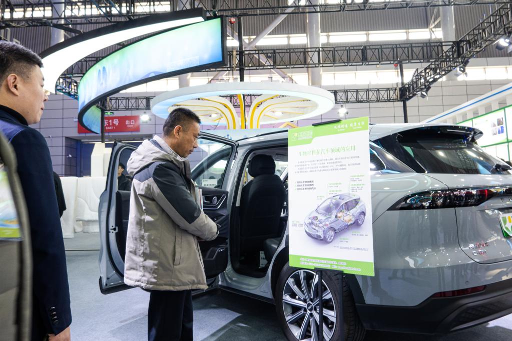12月20日,在安徽省合肥市举办的第八届安徽秸秆暨畜禽养殖废弃物综合利用产业博览会会场,参观者了解以秸秆为原料制作的汽车内饰。新华社记者赵金正 摄