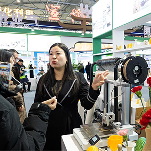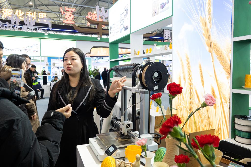 12月20日,在安徽省合肥市举办的第八届安徽秸秆暨畜禽养殖废弃物综合利用产业博览会会场,展商正在介绍以秸秆为原料制作的3D打印耗材。新华社记者赵金正 摄