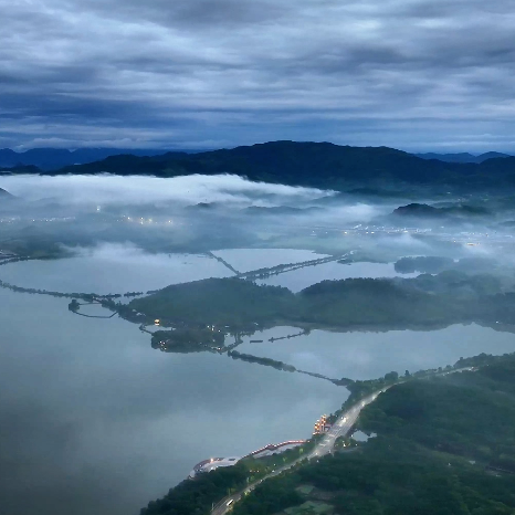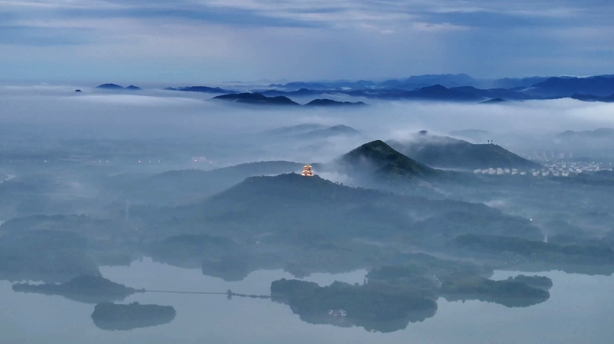 一场春雨过后,安徽省池州市云雾缭绕,城市、山峦和湖泊若隐若现,宛如一幅水墨丹青画卷。