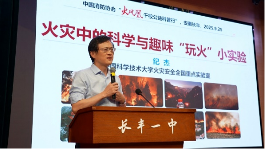 在科普报告环节,纪杰从火灾的历史演进切入,系统讲解了火灾的历史、形成机制,以及建筑、森林和工业等不同类型火灾的特点与危害,强调了提升消防安全意识、普及防火知识的迫切性。报告中穿插了许多引人入胜的趣味知识点,如苏东坡不为人知的“防火专家”身份、故宫太平缸设计中的防火智慧、影视作品中“烟头引燃汽车”场景的实验辟谣等。同时,展示了当前的先进消防科技,如无人机灭火、机器狗搜救等新装备,极大地激发了观众的好奇心。报告中还进行了一系列趣味互动小实验,让现场气氛掀起一个又一个高潮。学生们积极参与、亲身体验,对火灾科学知识有了更深刻的认识。同时,此次活动向长丰县中小学共计捐赠消防科普图书600册。(齐琪)