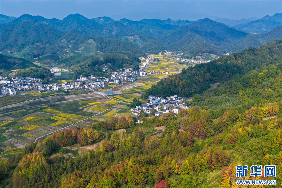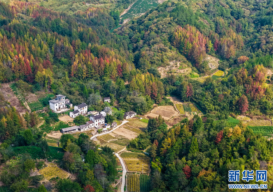 10月28日,在安徽省黄山市歙县溪头镇桃源村拍摄的乡村缤纷秋色(无人机照片)。