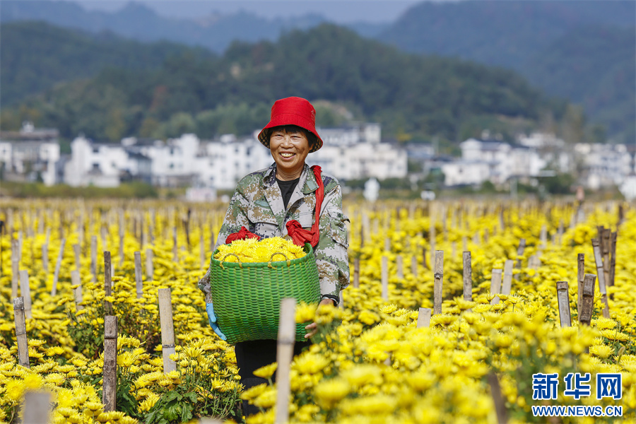 近年来,歙县依托土地以及乡村旅游资源,发展观赏性强、经济价值高的金丝皇菊种植,引导企业延长产业链,深加工菊花产品,提高附加值,带动农民增收,推动农旅融合发展。新华网发(施亚磊 摄)