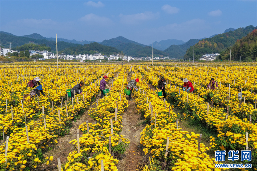 金秋时节,安徽省黄山市歙县溪头镇千亩金丝皇菊陆续进入采摘期,农民趁着晴好天气采摘菊花。
