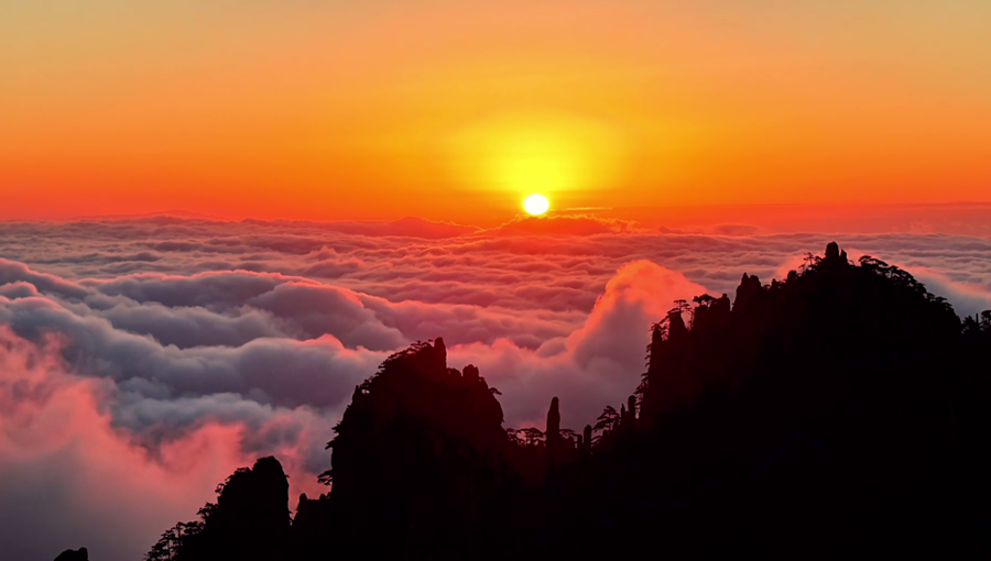 近日,安徽黄山风景区出现壮观的云海日出景观。红日初升,云海如浪涛翻涌,瞬息万变,犹如一幅幅彩色的油画,美不胜收。(侯瑞冬)