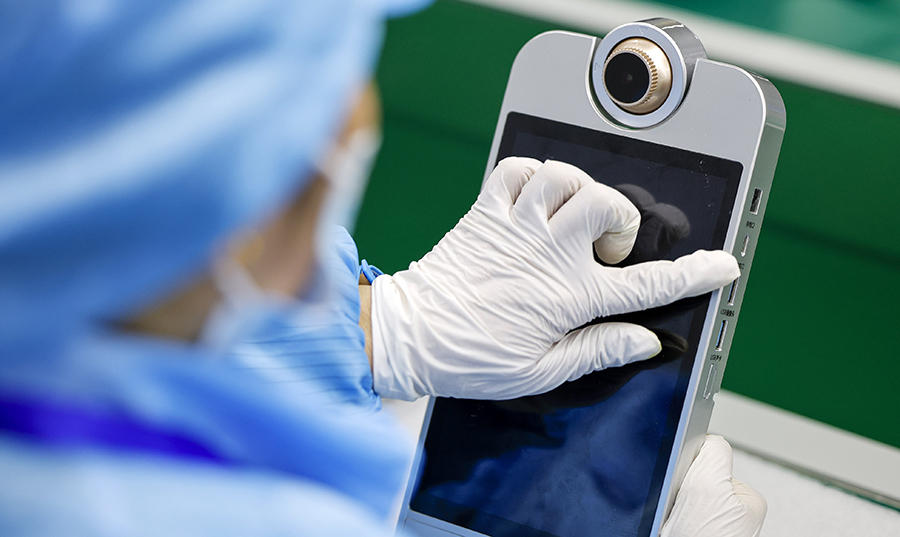 12月8日,安徽省黄山市黟县经济开发区安徽灵境互动科技有限公司,技术人员正在组装AI智能直播机。