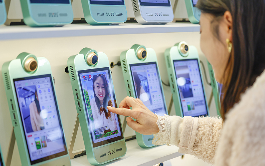 12月8日,安徽省黄山市黟县经济开发区安徽灵境互动科技有限公司,工作人员正在展示AI智能直播机。