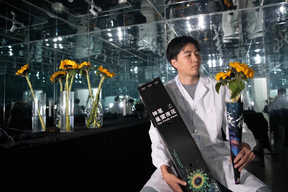 12月10日,在合肥神笔生物科技有限公司,研发人员苗良杰展示公司研发生产的能够在暗环境下自主持续发光的向日葵。新华社记者 张端 摄