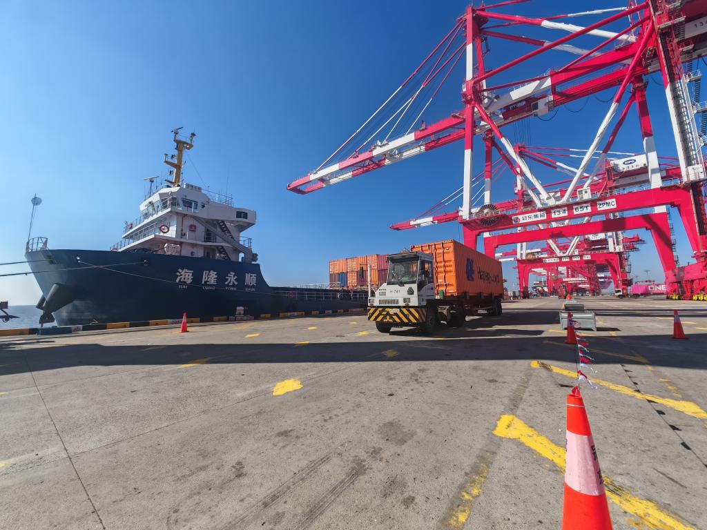 洋山港海事局政务中心负责人表示,该航线还创新应用了上海海事局水水中转“一箱制”运输模式,出口中转申报手续从最多6次减少至3次,减少了重复申报和开箱检查。