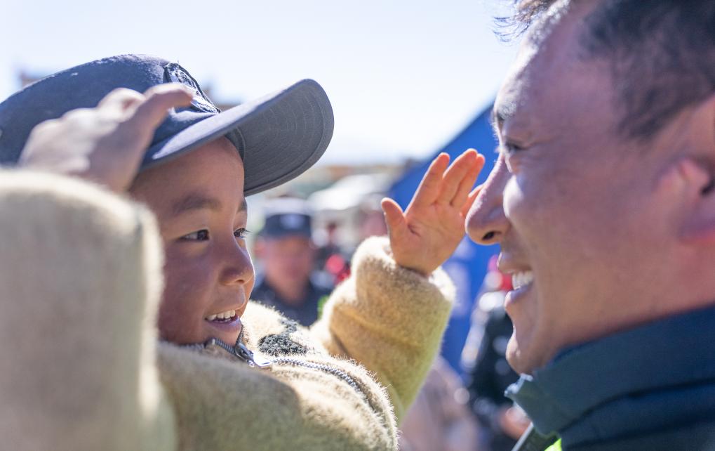 2025年1月14日,在西藏定日县长所乡嘎布村,一名小朋友戴上移民警察米玛次仁的帽子敬礼。新华社记者 丁增尼达 摄