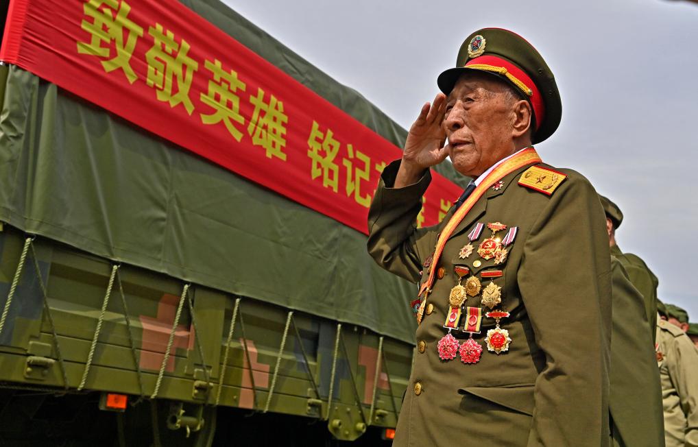2025年9月12日,第十二批在韩中国人民志愿军烈士遗骸回国。这是志愿军老战士在沈阳抗美援朝烈士陵园门口迎接运送志愿军烈士遗骸的车队。新华社记者 周华 摄