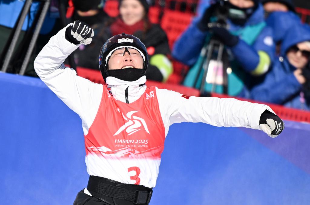 2025年2月9日,徐梦桃庆祝夺冠。当日,在亚布力举行的第九届亚冬会自由式滑雪女子个人空中技巧决赛中,中国选手徐梦桃、陈雪铮包揽冠亚军。新华社记者 夏一方 摄