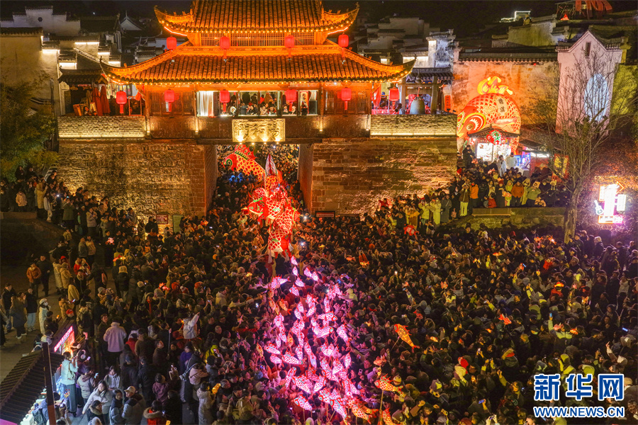 当日晚,“大鱼徽州 鱼你有约”2026安徽歙县鱼灯艺术提升展演在黄山市徽州古城开幕。展演活动以徽州传统民俗歙县鱼灯为载体,通过“引子·端鱼·欢鱼·嬉鱼”四个篇章,将民俗鱼灯进行艺术化与场景化的现代表达,展现非遗鱼灯的活态传承,吸引众多游客驻足观看,欢庆新年。新华网发(施亚磊 摄)