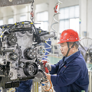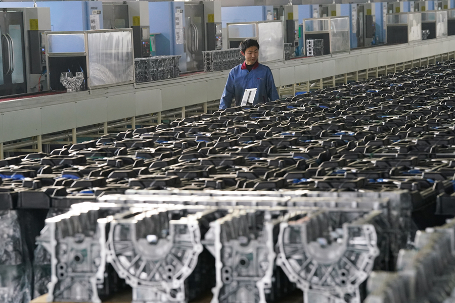 2025年3月11日,工人在滁州悦达实业有限公司查看生产完成的混动发动机缸体。新华社记者杜宇摄