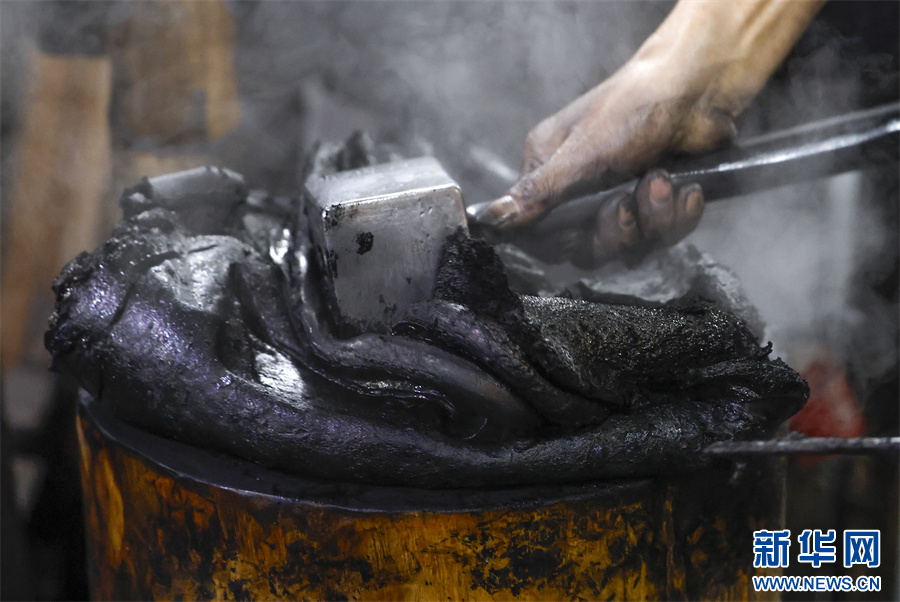 近日,在安徽省黄山市歙县老胡开文墨厂,制墨手艺人正在制作马年主题徽墨。