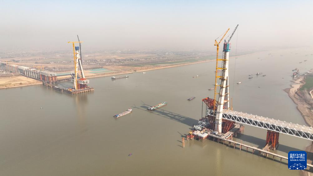 1月15日拍摄的池州长江公铁大桥施工现场。画面左侧为南主塔(无人机照片)。