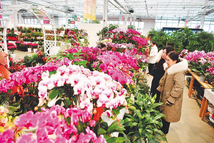 “迎春花市”展馆内花香四溢,鲜切花、高档盆栽、观果植物品种丰富,长势喜人。