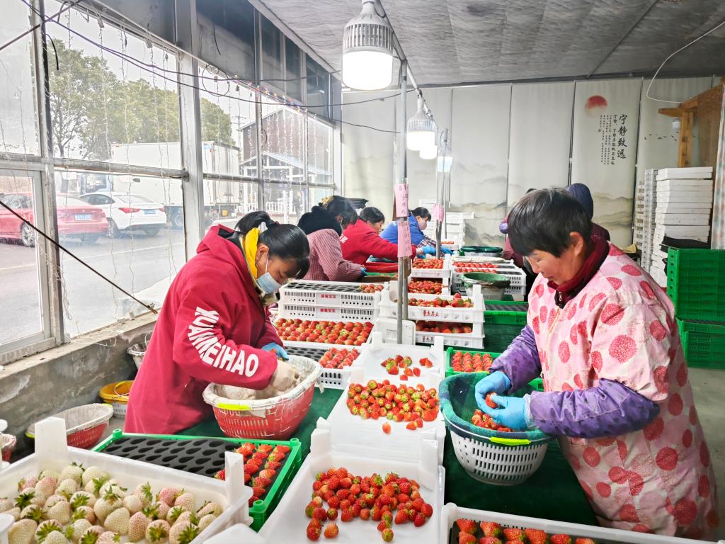 近日,安徽省长丰县一处草莓分拣中心,李杨村村民李玉莲(右一)在分拣草莓。新华社记者张晓洁 摄