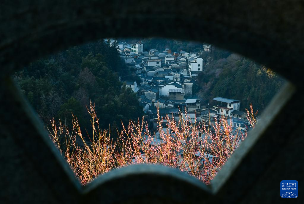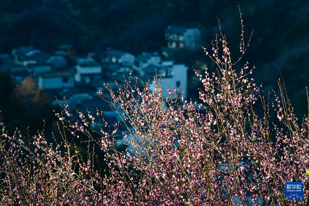 近日,在安徽省黄山市歙县雄村镇卖花渔村,漫山遍野的梅花绽放,花海与徽派村落民居相映成趣,景美如画。