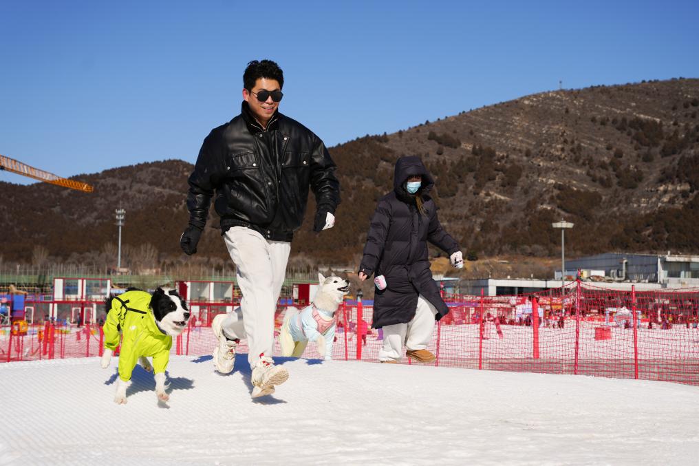 2月7日,在北京渔阳·宠趣里宠物滑雪主题乐园,主人引导宠物狗越过雪坡,体验“雪地障碍挑战赛”项目。
