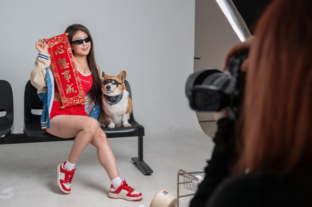2月2日,在湖北省武汉市一家宠物影像馆,一名顾客和自己的宠物狗拍摄新年写真。