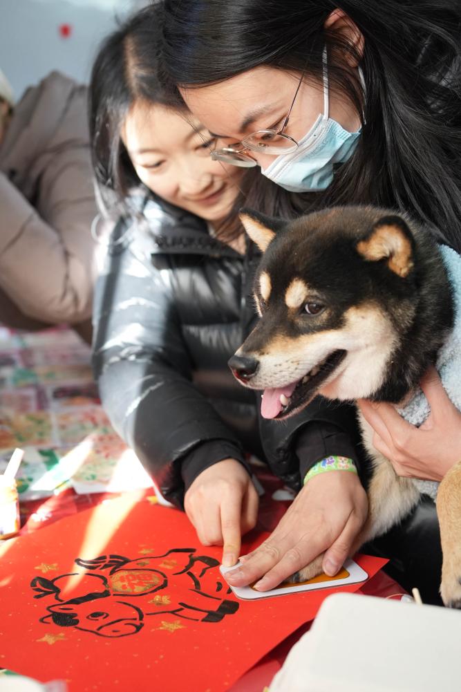 1月31日,在北京市昌平区“北京犬时代宠物公园”内的宠物庙会上,宠物狗在福字上拓印爪印。