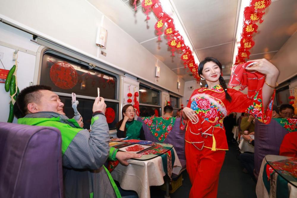 旅客在哈尔滨至漠河的K7041次列车上欣赏二人转。新华社发(徐率摄)