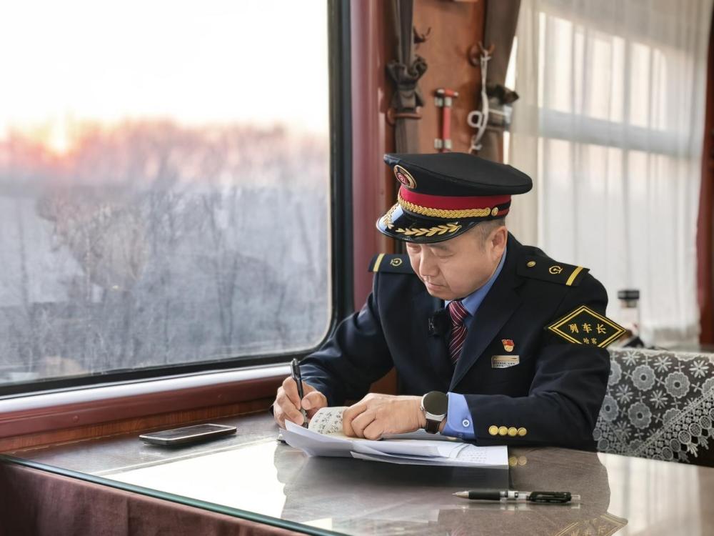 Z114/Z111次旅客列车列车长王希军做工作记录。(2025年11月25日摄)新华每日电讯记者张玥摄