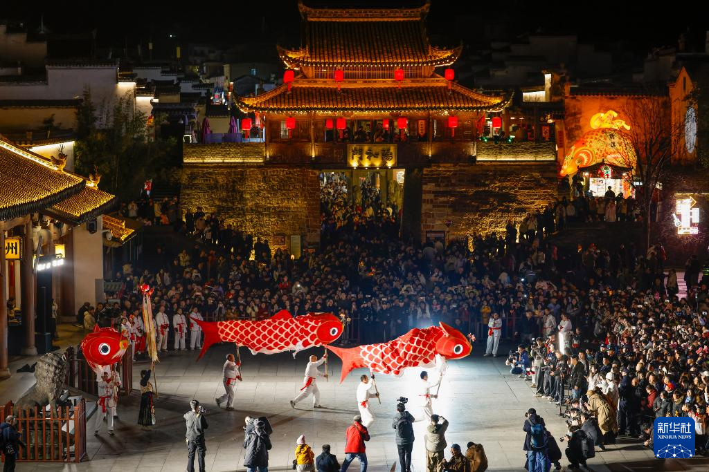 2月4日,在安徽省黄山市歙县徽州古城,人们在观看渔梁鱼灯队表演。