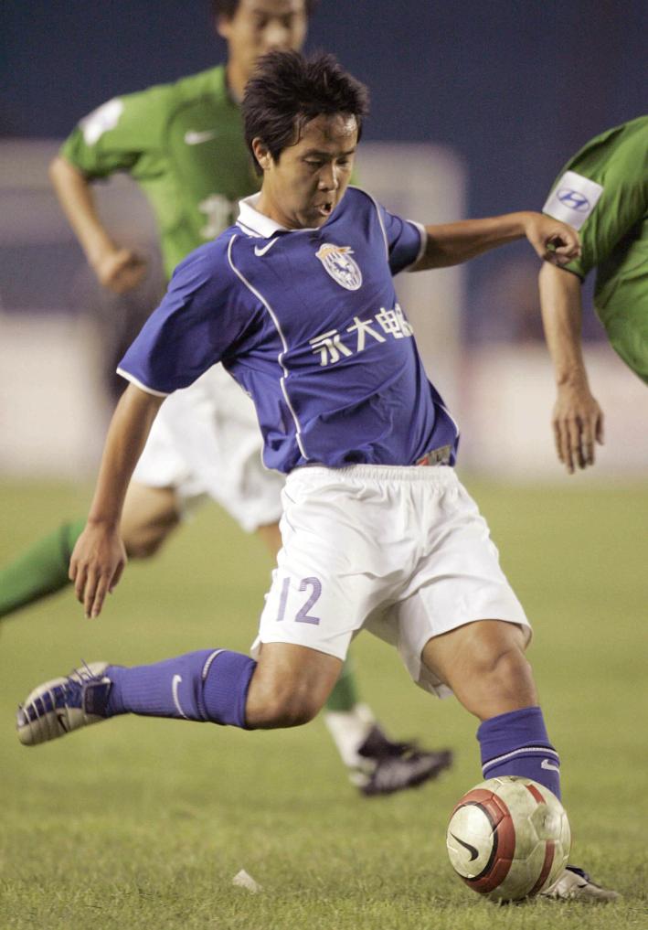 2005年5月18日,上海国际队球员詹可强(前)在与北京现代队的比赛中起脚射门。当日,在中超联赛杯第一轮第一回合比赛中,北京现代队主场以1:0击败上海国际队。新华社记者 郭勇 摄