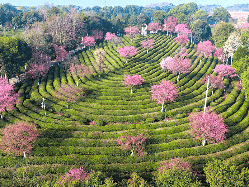 2026年3月12日,安徽省黄山市徽州区谢裕大茶博园拍摄的樱花茶园。