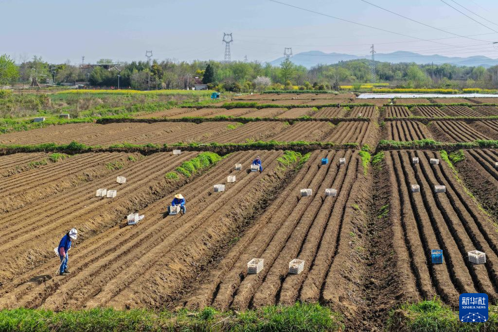 4月2日,在安徽省铜陵市义安区天门镇,农民在姜田里劳作(无人机照片)。新华社发(储著传 摄)