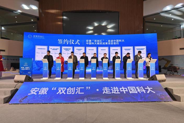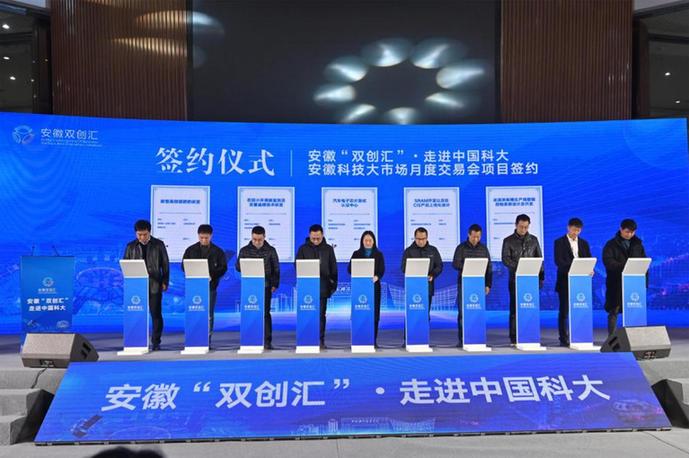 会上,9项中国科大赋权成果项目成功签约,10项安徽科技大市场交易成果现场签约,云发布了今年2月交易成功的83项项目,线上线下签约额近25亿元。活动还现场邀请安徽瀚海博兴公司总经理汪国兴、安徽云玺量子公司总经理童迎伟2位中国科大校友结合“科大硅谷”建设讲述了其创新创业故事。