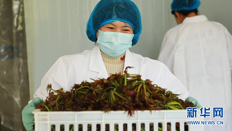 在太和县大新镇广缙村香椿种植基地,太和县润天食品有限公司负责人刘海燕正在采购香椿芽,2011年刘海燕成立了这家香椿生产加工企业,每年香椿收获的季节,也是她最忙碌的时候。