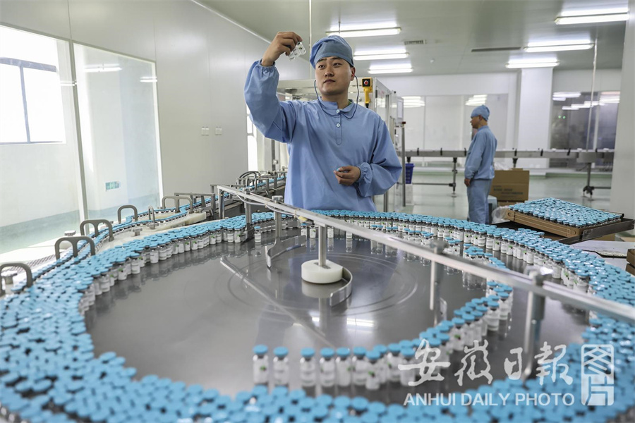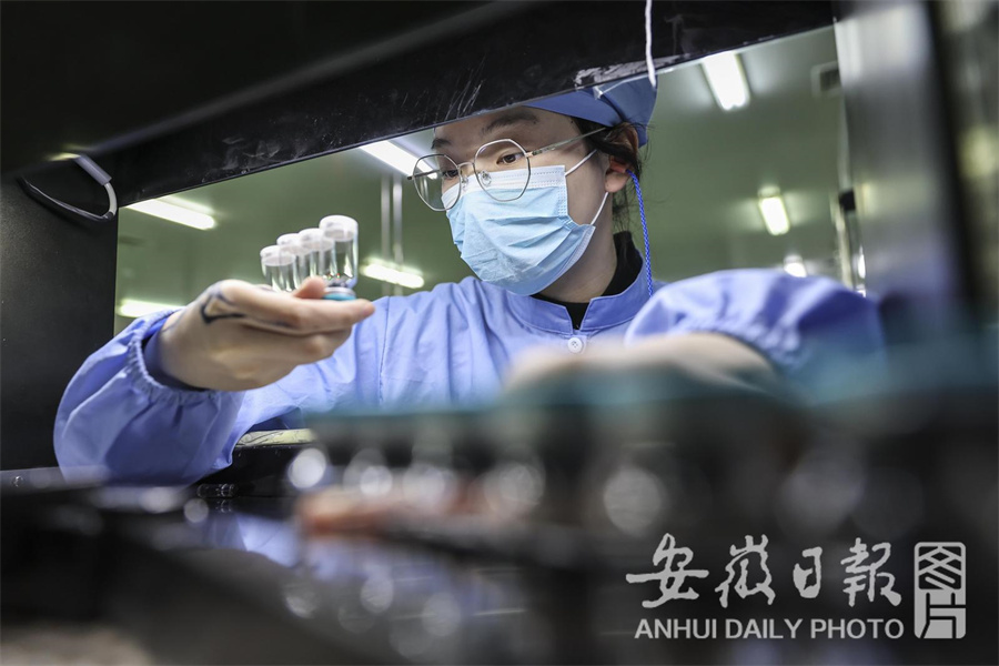 4月8日,在位于淮南经开区的国药集团国瑞药业有限公司的生产车间内,工人在生产药品。该公司是一家集药品研发,生产,销售为一体的医药工业企业,冻干工艺全国领先。