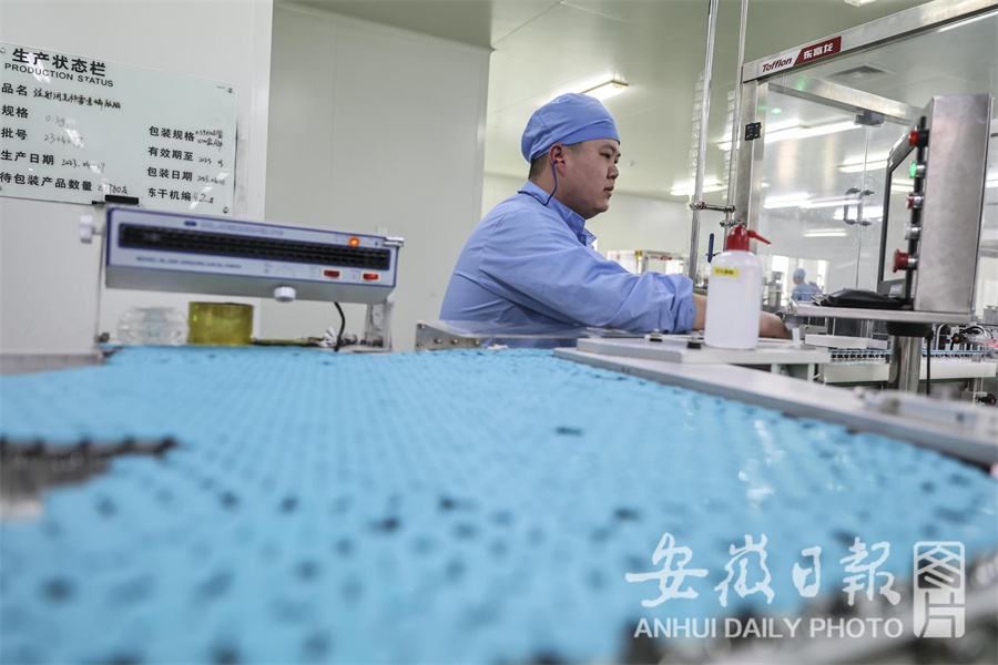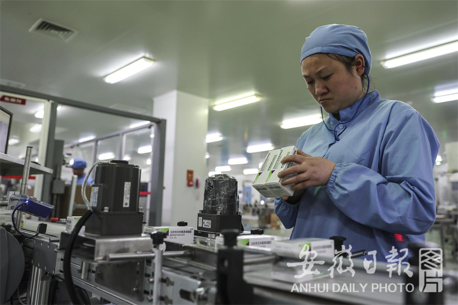4月8日,在位于淮南经开区的国药集团国瑞药业有限公司的生产车间内,工人在生产药品。