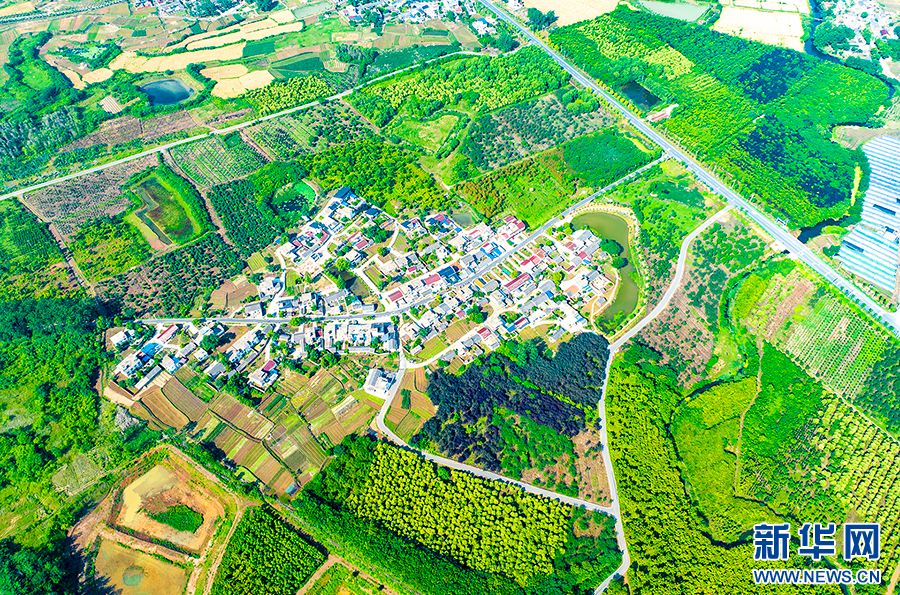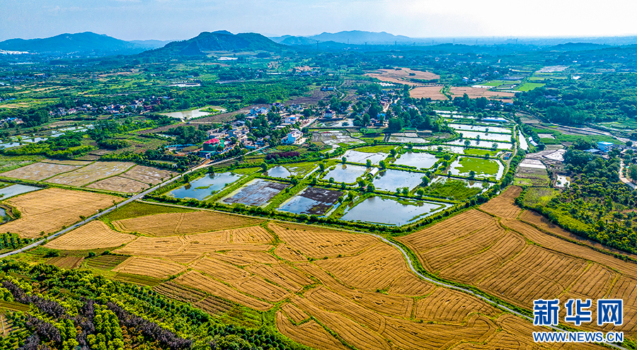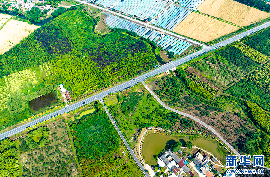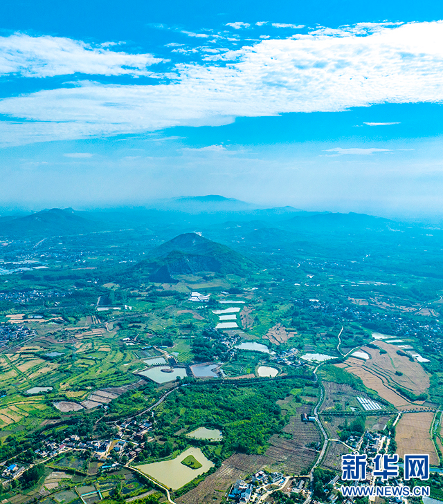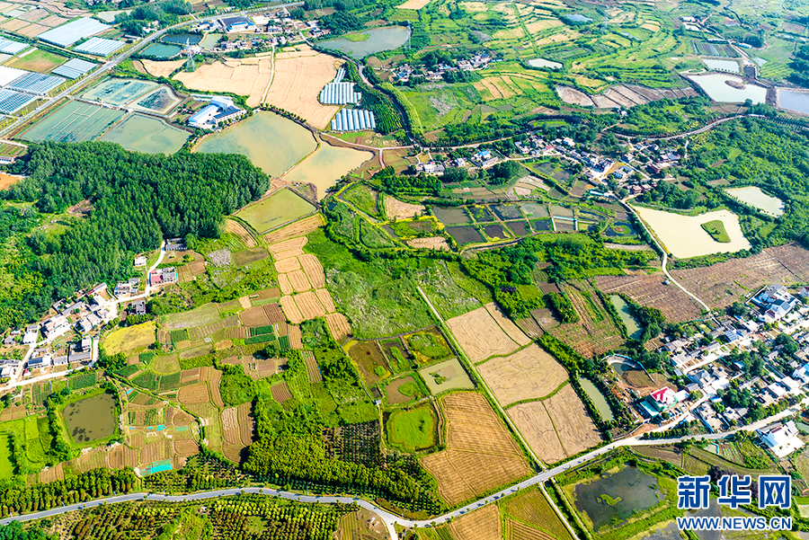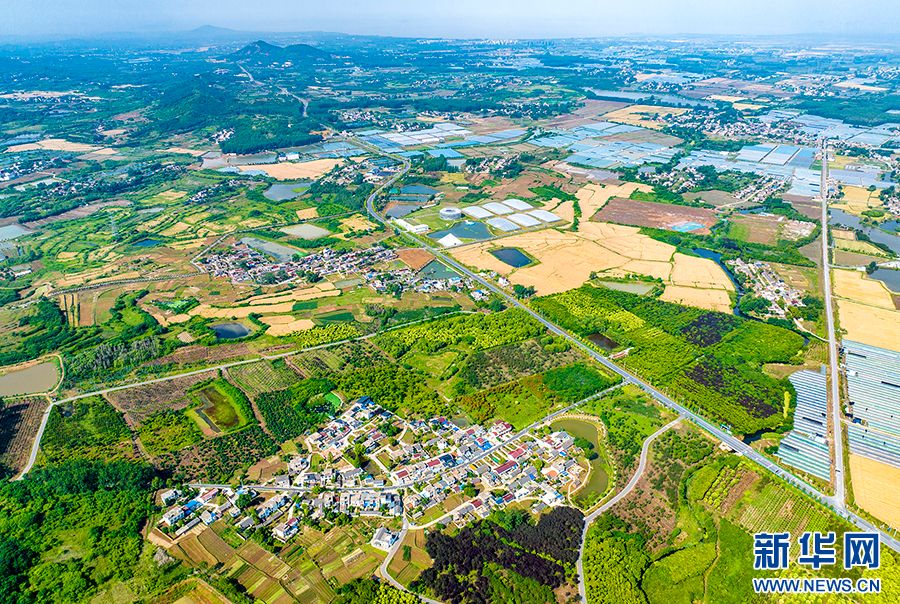 6月1日,航拍初夏时节的安徽省合肥市肥东县桥头集镇田园风光,阡陌田垄与青山、村庄、公路和绿树交织成一幅大地油画。