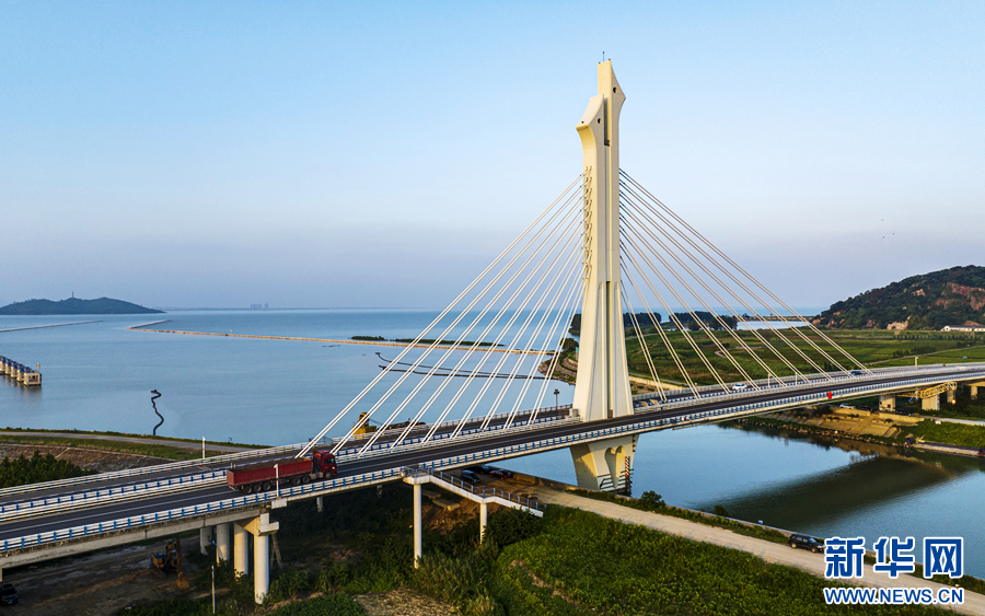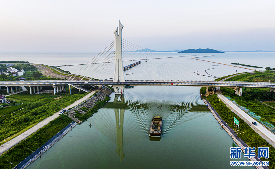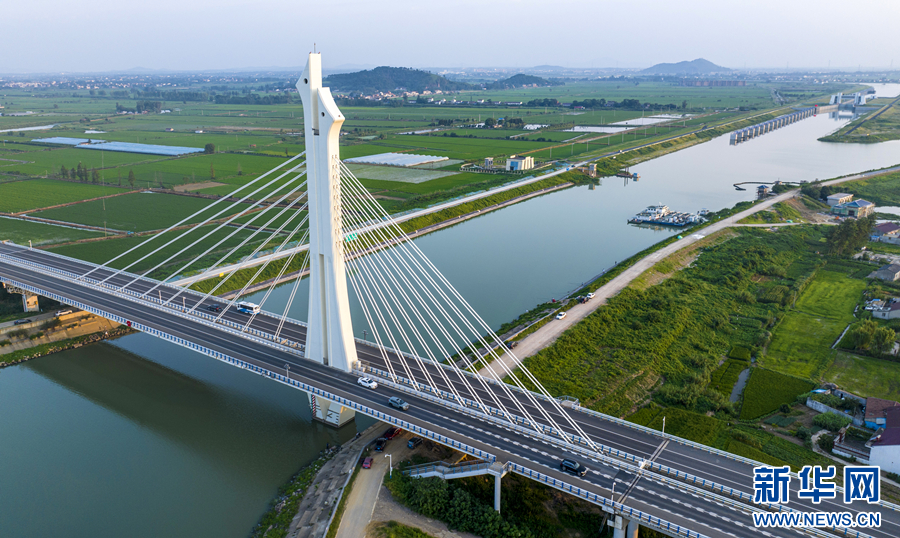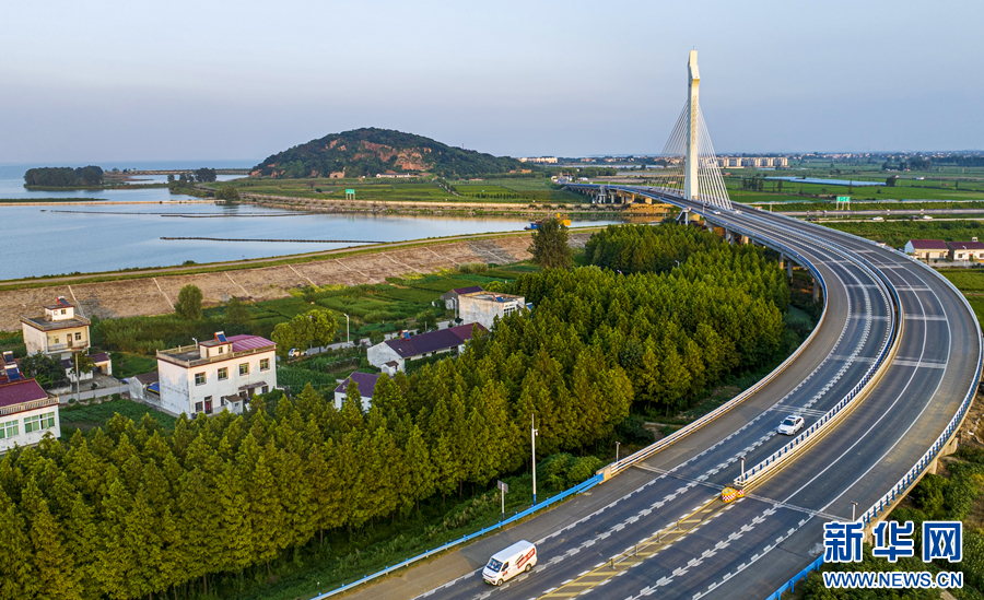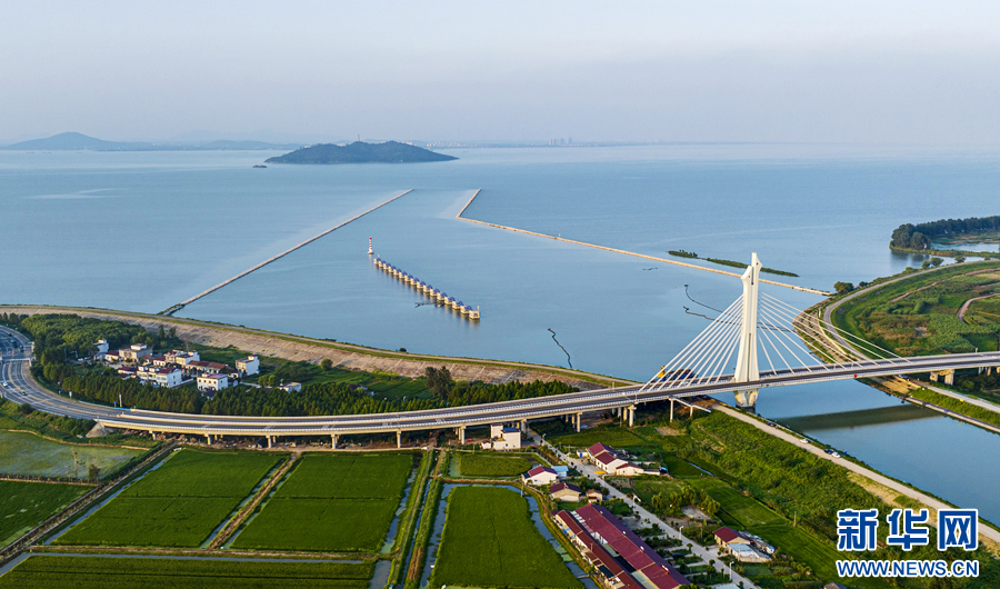 8月5日,车辆行驶在安徽省合肥市庐江县白山镇境内的白石天河大桥上,一泓清水从桥下汇入巢湖,景美如画。