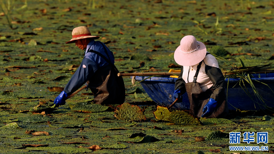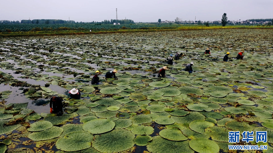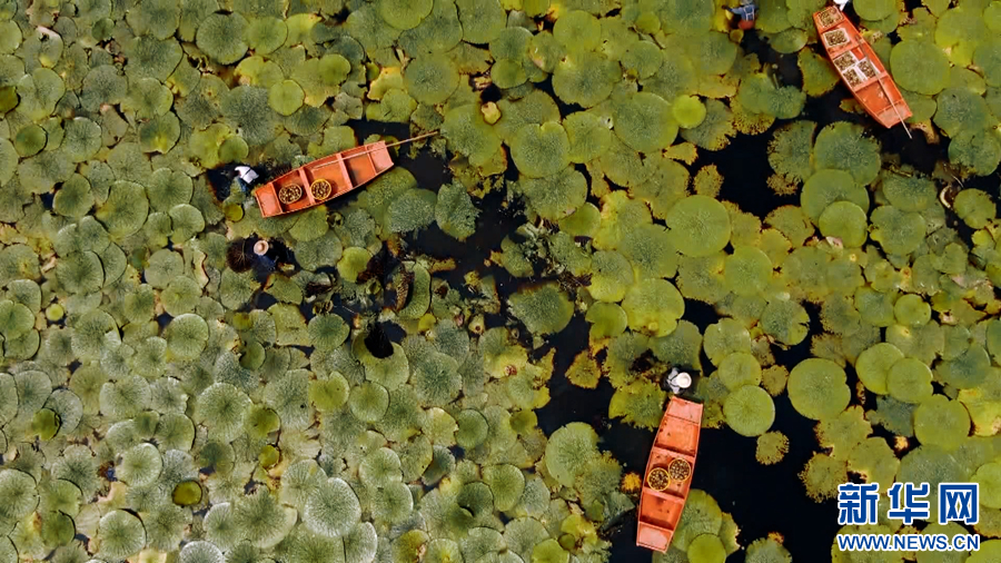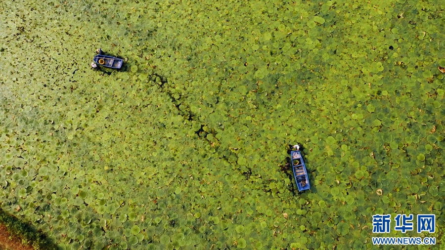 机驳船、捞芡人,勾勒出一片采收芡实的忙碌场景,立秋之后,安徽省阜南县王家坝镇李郢社区的芡实种植基地里,满塘芡实已进入成熟采摘期。