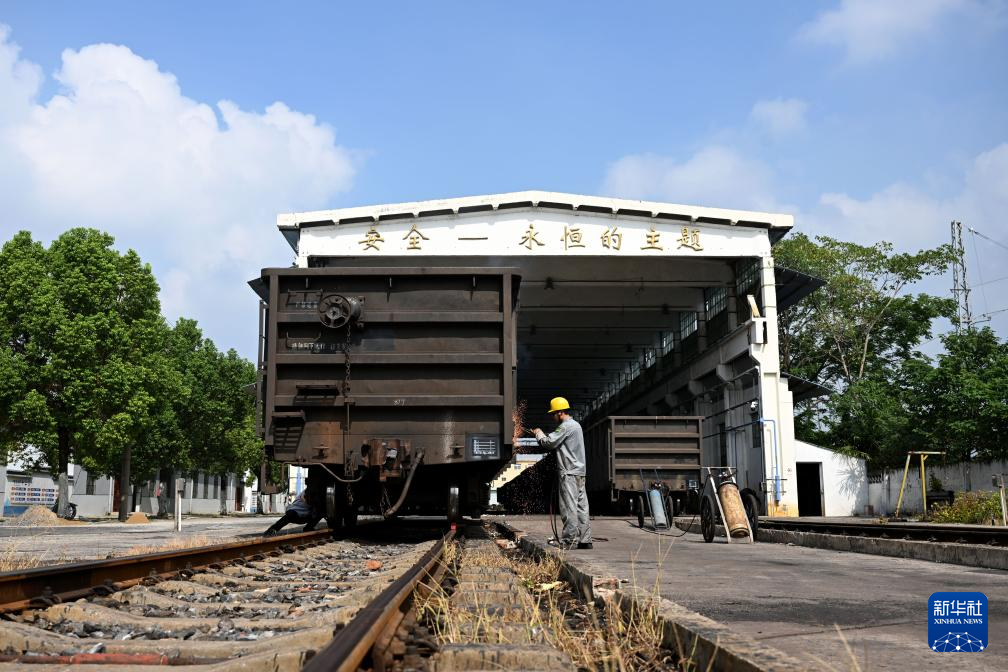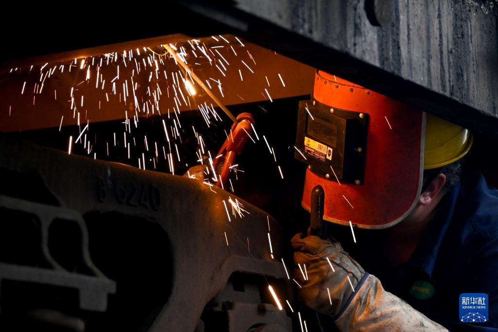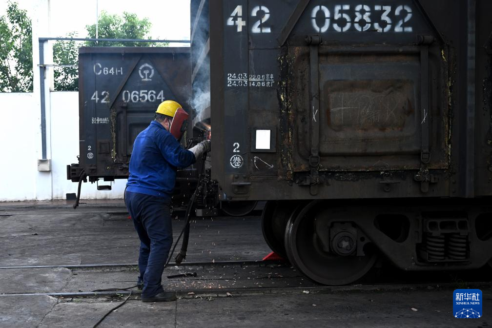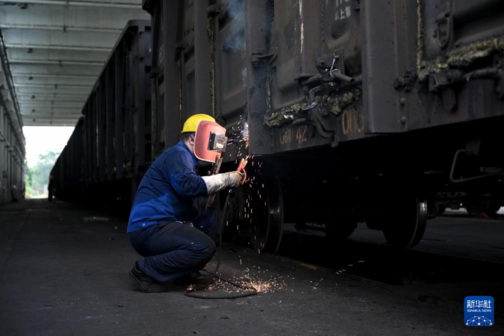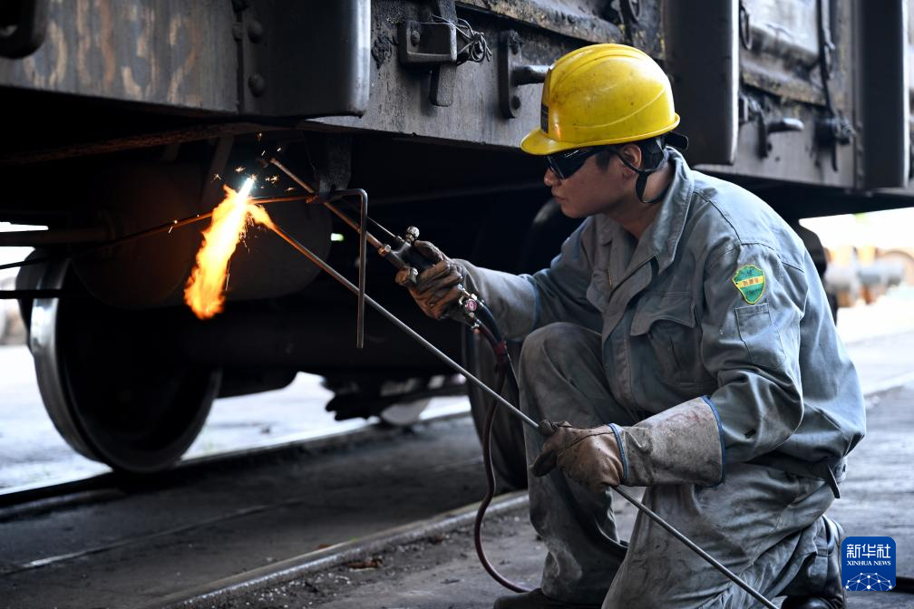 8月20日,中国铁路上海局集团有限公司杭州北车辆段合肥运用车间临修班组熔接工周安东对列车进行维修。新华社记者 黄博涵 摄