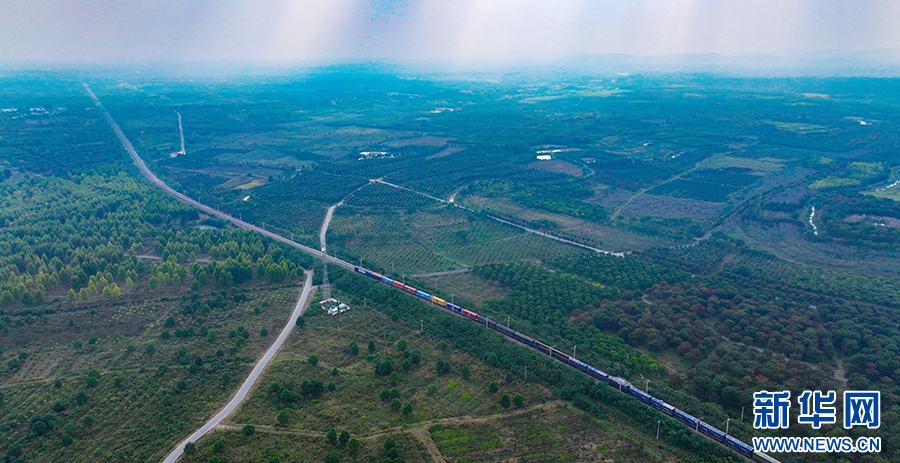 10月11日,航拍安徽省合肥市肥西县官亭镇6万亩林海。一列货运火车从林海中穿过。