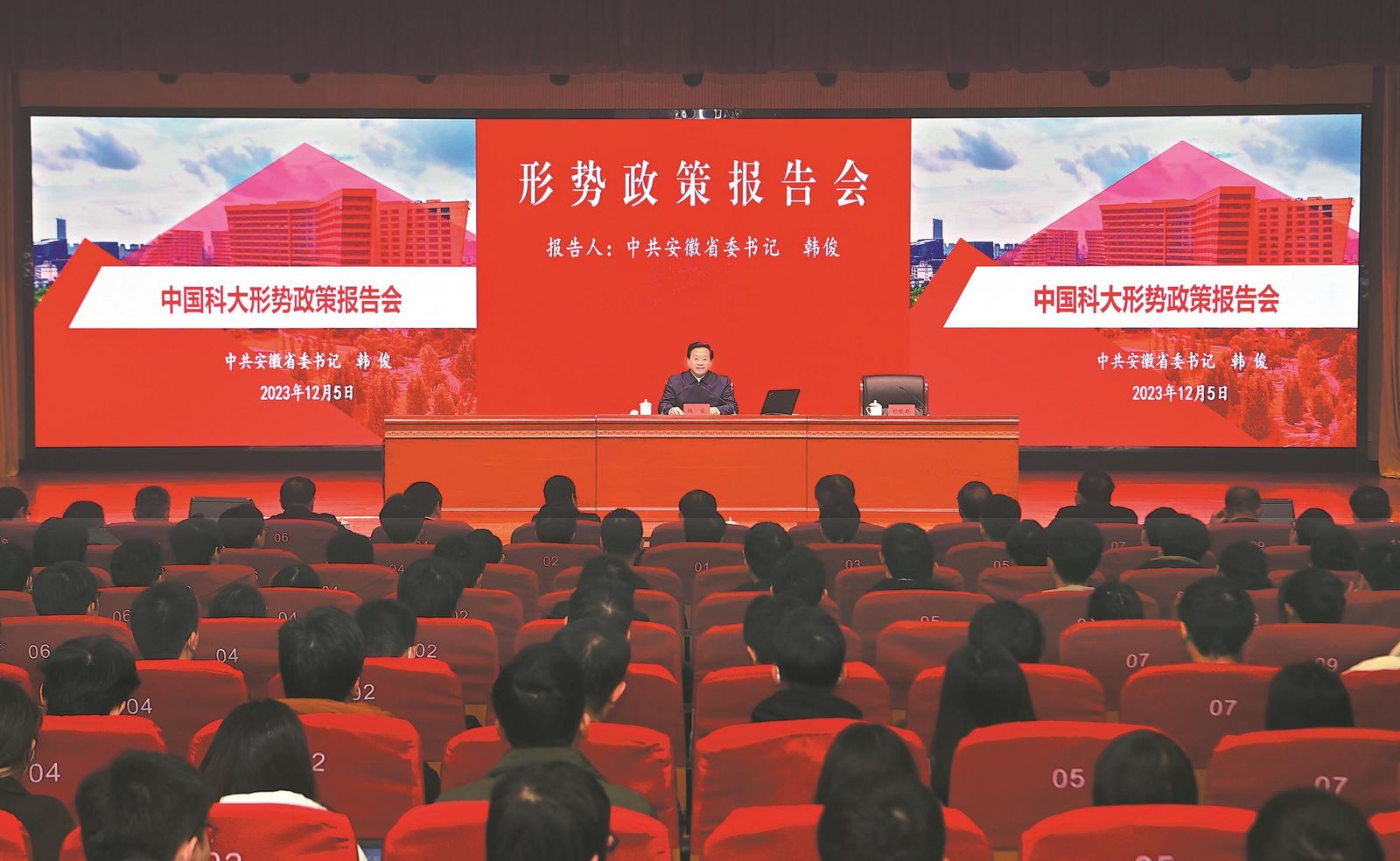 12月5日上午,省委书记韩俊专程赴中国科学技术大学作形势政策报告。他强调,要深入学习贯彻习近平总书记重要讲话重要指示精神,潜心立德树人,勇攀科技高峰,争做中国式现代化的先锋力量,书写新时代省校合作崭新篇章。省委常委、秘书长、政法委书记张韵声,副省长任清华,中国科大校长包信和出席。中国科大党委书记舒歌群主持报告会。中国科大500余名师生代表参加报告会。