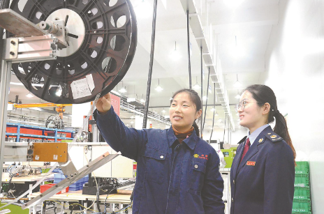 12月11日,阜阳市颍东区税务局青年税务干部来到阜阳冈奇精密科技有限公司车间宣讲税费优惠政策,了解企业生产经营销售情况。本报通讯员 李 民 摄