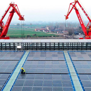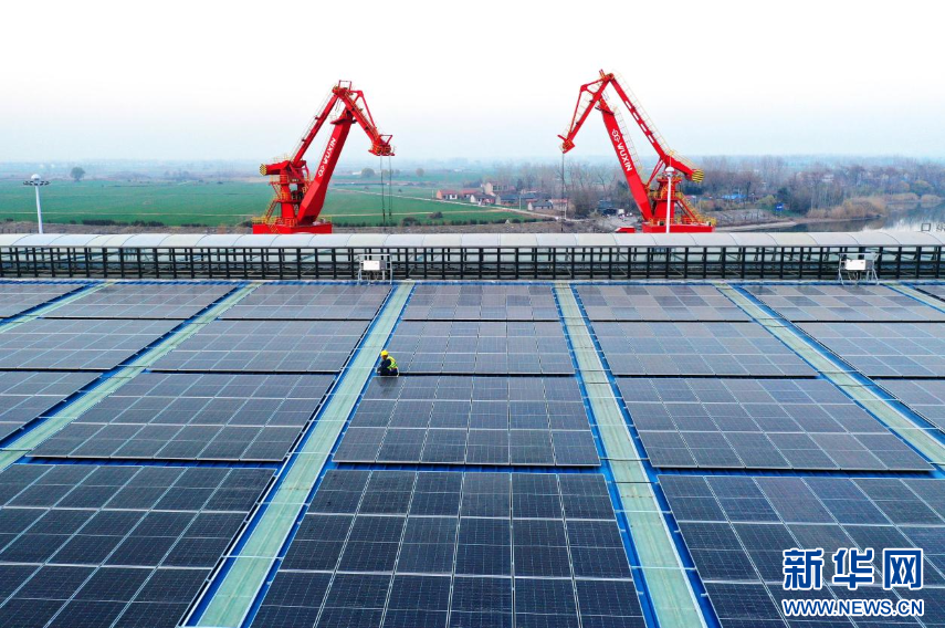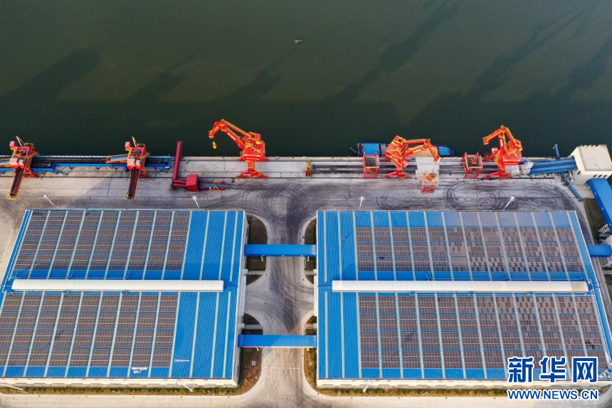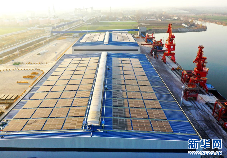 该项目由国网淮北供电公司与孙疃港共同合作,利用港区内矿建仓库、炼焦煤仓库房屋顶建设1.54兆瓦分布式光伏发电系统,面积达到1.6万平方米,共安装 280块 550Wp 光伏组件。并依托分布式光伏电站、岸电、全电厨房、充电桩、储能等应用场景,融合云计算、移动互联网、大数据、5G等数字技术,以智慧用能平台为支撑,以绿电交易为补充,实现数据互联互通和资源精准调节,推动港口绿色低碳转型。新华网发(李鑫 摄)